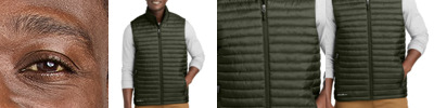 Designed with traditional quilt lines, this insulated vest is built for warmth and weather-resistant performance. Features include full-length interior storm flap with chin guard, exposed, molded zippers with Eddie Bauer logo pulls, zippered hand pockets and a slight drop tail hem. Includes a decoration access pocket. Packs into zippered left hand pocket. Contrast Eddie Bauer heat transfer logo on right hem. Made of 100% polyester ripstop and 3.8-ounce, 100% polyester blown fill. PU coating on back of shell. Durable water-repellent (DWR) finish.