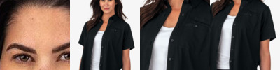 - Relaxed open neckline with twill placket and self-fabric collar